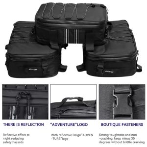 - Large-capacity waterproof motorcycle backpack with reflective safety strip, suitable for helmets, laptops, and travel essentials.
