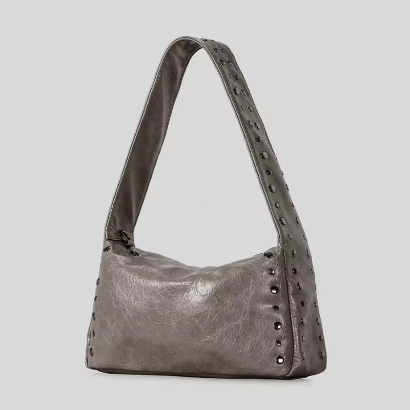 Soft leather women’s shoulder bag with rivet accents, large capacity, and detachable strap for versatile carrying.