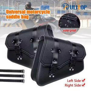 - Universal PU leather motorcycle side saddlebag with durable construction, matte black finish, and easy strap mounting. Fits Honda, Suzuki, Yamaha, and most other bikes. Perfect for tools and travel essentials.